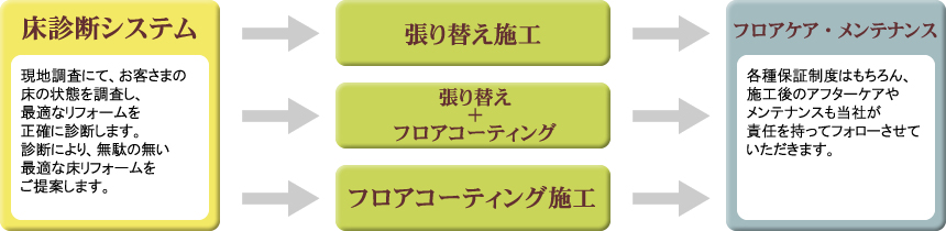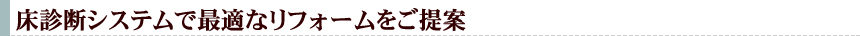 床の張り替えでいちばん大切なことは「現地調査」です。古くなった床の状態は、施工状態や素材、床下の状況や環境によって異なります。本当に有効なフローリングリフォームをご提案するには、現地調査が欠かせません。パッケージ価格や激安店の応急処置的な張り替えは、耐久性や安全性に問題があるケースも少なくはないのです。床工事の専門家として、大型マンションから各種施設の張り替え実績を多数持つ当社が、お客様のフローリングリフォームをプロデュースします。