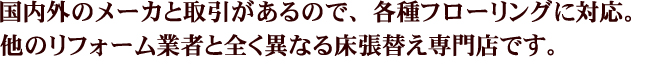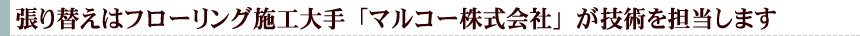 マルコー株式会社は、マンション・住宅のフローリング工事・二重床工事・巾木工事ほか、床工事で国内最高の技術と実績を誇る企業です。このマルコー株式会社と弊社との提携により、大手建設会社の新築マンションの全棟フローリング工事や大型リフォーム等の高度な技術と品質を、個人のお客様にご提供いたします。